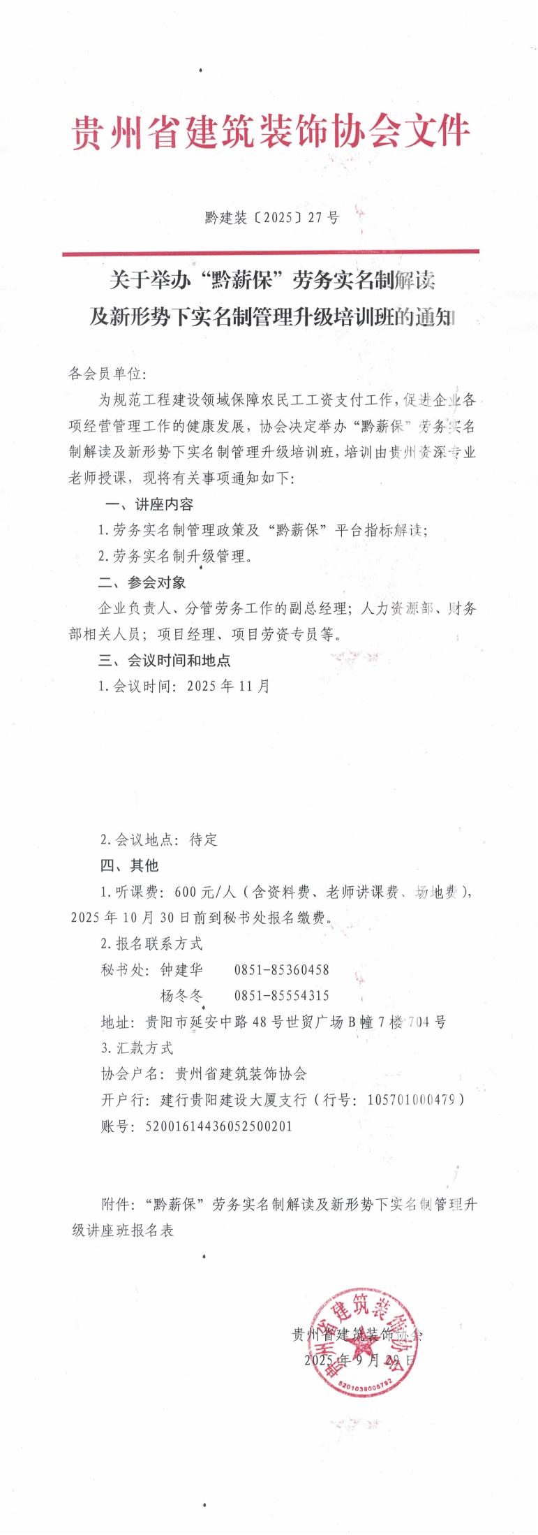 关于举办“黔薪保”劳务实名制解读及新形势下实名制管理升级培训班的通知