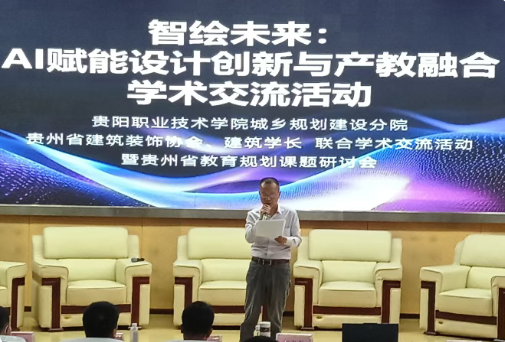 为深化产教融合、抢抓AI技术与建筑装饰行业融合机遇,2026年4月10日下午,贵州省建筑装饰协会联合贵阳职业技术学院城乡规划建设分院、行业先锋“建筑学长”,在学院学术报告厅共同举办“智绘未来:AI赋能设计创新与产教融合”学术沙龙,活动汇聚校企代表、师生共300余人,聚焦AI时代设计创新与产教融合新路径,共促行业高质量发展;贵阳职业技术学院科技处副处长李波出席并致辞,贵州省建筑装饰协会会长张大立出席并作总结讲话,城乡规划建设分院党总支书记熊光奎主持活动,学院领导班子、各科室及教研室负责人、师生代表,与我会领导、会员企业高管、技术总工等共同参与活动。
