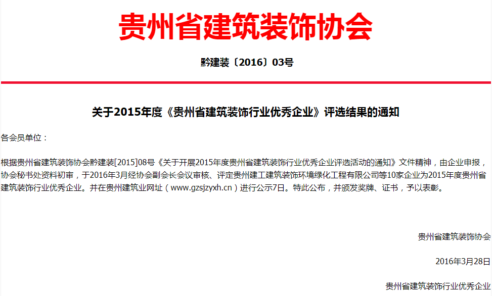 关于2015年度《贵州省建筑装饰行业优秀企业》评选结果的通知