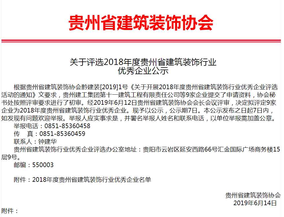 贵州省建筑装饰行业2018年度优秀企业公示名单