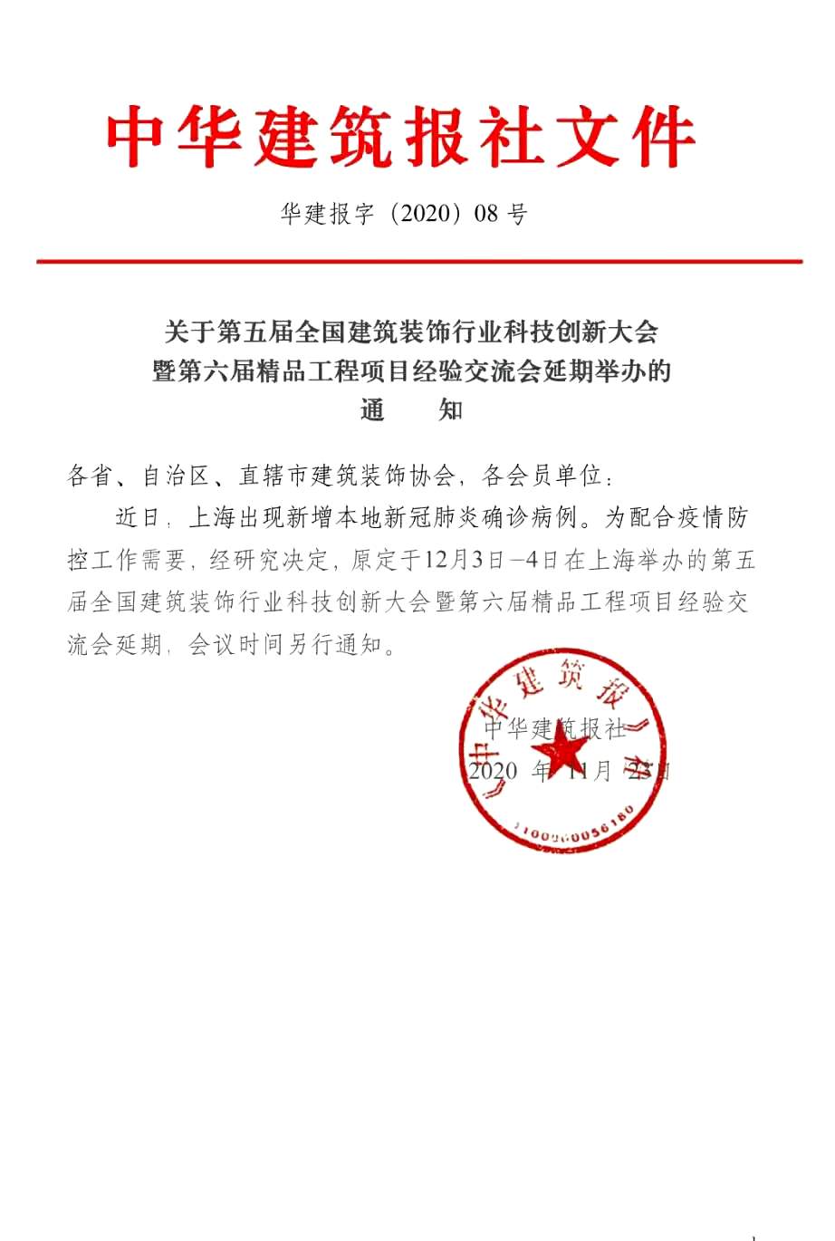 紧急通知 关于第五届全国建筑装饰行业科技创新大会暨第六届精品工程项目经验交流会延期举办的通知