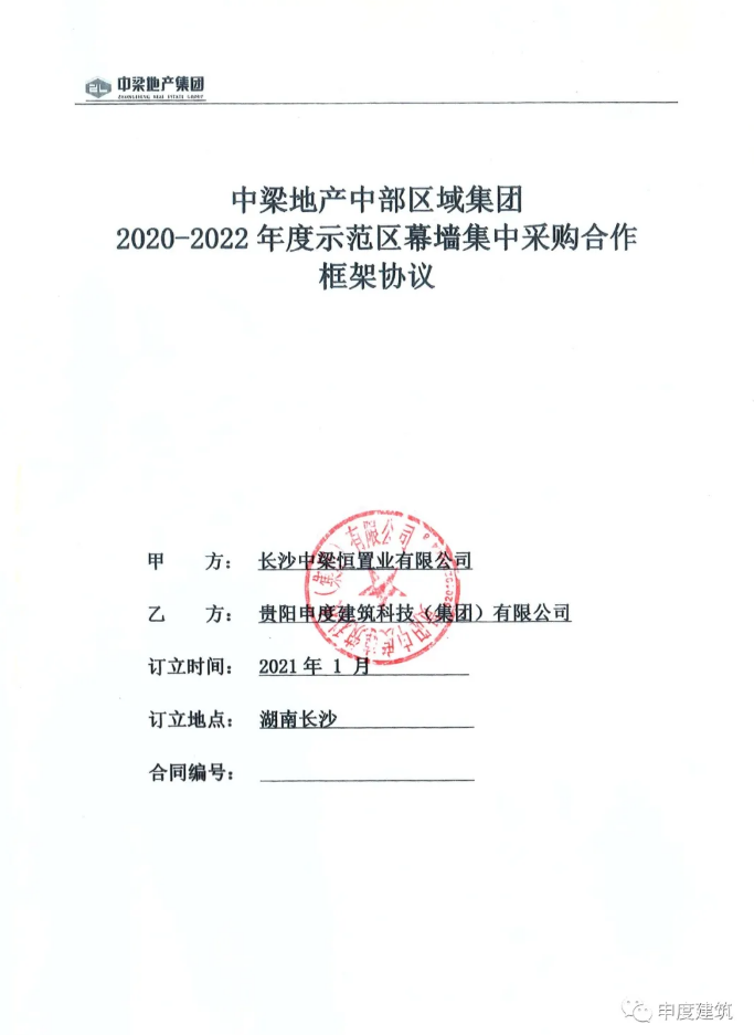 近日,贵阳申度建筑科技(集团)有限公司成功与长沙中梁恒置业有限公司签订“中梁地产中部区域集团2020-2022年度示范区幕墙集中采购合作框架协议”,项目位于贵州省内。