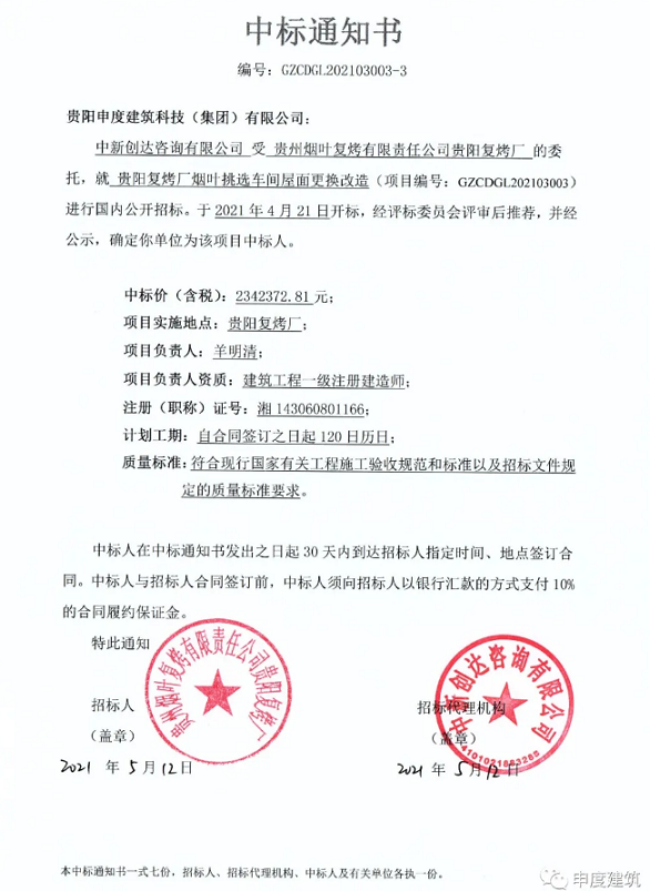 近日,贵阳申度建筑科技(集团)有限公司成功中标“贵州烟叶复烤厂挑选车间屋面维修项目”,该项目位于贵州省贵阳市南明区。