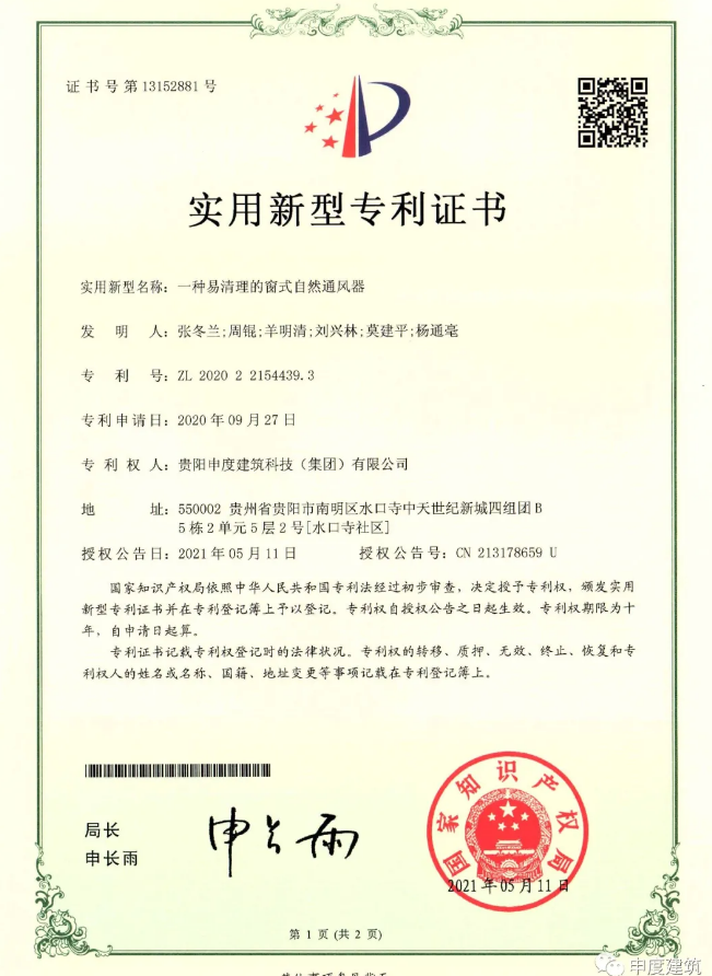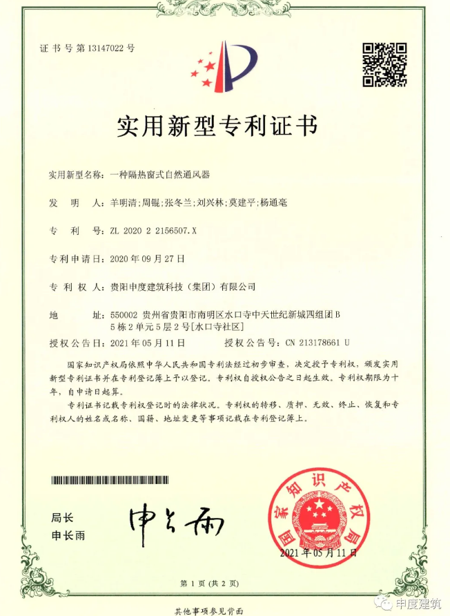 另:我公司在2020年9月向国家知识产权局申请3项专利发明,已于2021年5月11日取得证书,分别是(一种隔热窗式自然通风器、一种可调节窗式自然通风器、一种易清理的窗式自然通风器)。