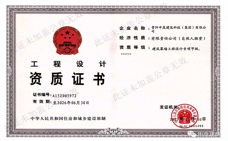 近日,贵阳申度建筑科技(集团)有限公司正式取得中华人民共和国住房和城乡建设部颁发的建筑幕墙工程设计专项甲级资质。建筑资质是衡量建筑企业综合实力的一杆标尺,近年来我司在持续发展的过程中,实力也得到了越来越多的认可。此次资质的成功升级是我公司资质建设的又一个里程碑,不仅为公司开拓工程设计市场打开局面,而且进一步拓宽了业务范围,为公司打造设计施工一体化品牌服务提供了更大的保障,确立了申度建筑集团在行业中的地位。