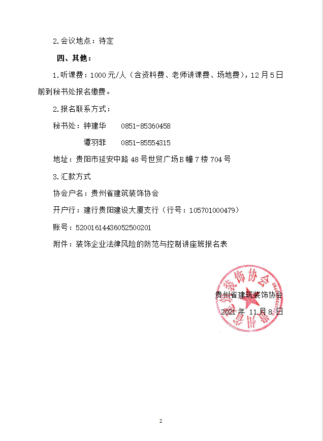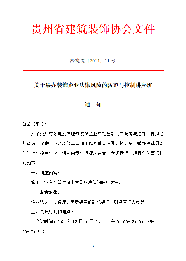 黔建装〔2021〕11号 关于举办装饰企业法律风险的防范与控制讲座班通知