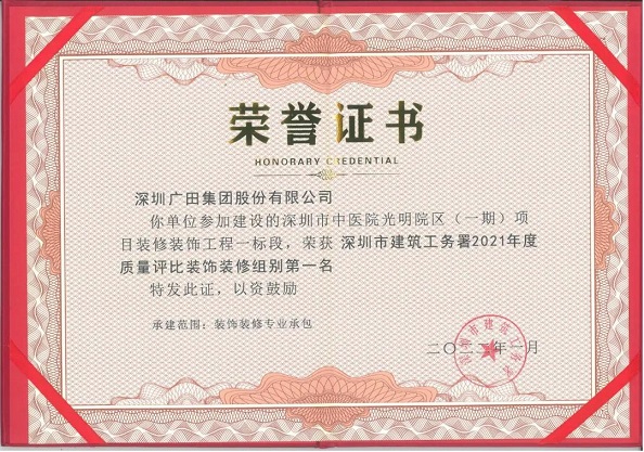 1月21日,在深圳市建筑工务署召开的“2021年度质量安全工作总结暨表彰大会”上,广田集团承建的深圳市中医院光明院区(一期)项目一标段荣获2021年度质量评比装饰装修组别得分第一名。同时,2021年度四季度质量得分的前三名也被广田集团全部收入囊中,它们分别是深圳市急救血液信息三中心公共卫生服务综合楼项目装饰装修工程、深圳市中医院光明院区(一期)项目装修装饰工程一标段、中山大学深圳建设工程项目(一期)建筑装修装饰工程五标段,充分彰显了广田集团“以高标准促质量,以严要求创品牌”的管理理念。